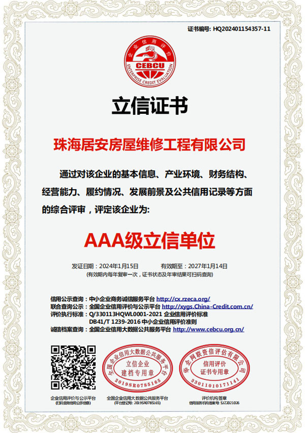 珠海居安房屋維修工程有限公司成立于2020年,是一家專注房屋維修的公司。我們擁有各類型專業(yè)人才,業(yè)務(wù)包括老舊建筑翻新改造、外墻空鼓修復(fù)、防水幕墻養(yǎng)護(hù)、外墻預(yù)置構(gòu)件拆除更換、供排水管網(wǎng)改造、墻面翻新、鋼制結(jié)構(gòu)建筑構(gòu)建及折除,外墻清洗及裝修裝飾。 公司自成立以來(lái),始終堅(jiān)持以人為本、誠(chéng)信敬業(yè)的經(jīng)營(yíng)原則,與多家單位達(dá)成固定維修、養(yǎng)護(hù)清洗協(xié)儀,業(yè)務(wù)遍及廣州、東莞、中山、珠海等多個(gè)周邊城市。專業(yè)化團(tuán)隊(duì)尤其在墻面及窗邊防水工程業(yè)內(nèi)知名。…… >>> 更多內(nèi)容 |